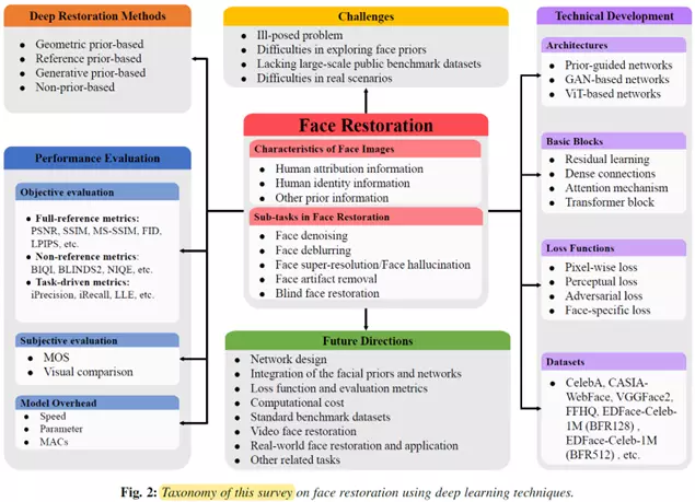 2. 总结了目前人脸复原面临的挑战,对现有方法进行分类及概述。方法主要包括两大类:基于先验的深度学习复原方法和无先验的深度学习复原方法;