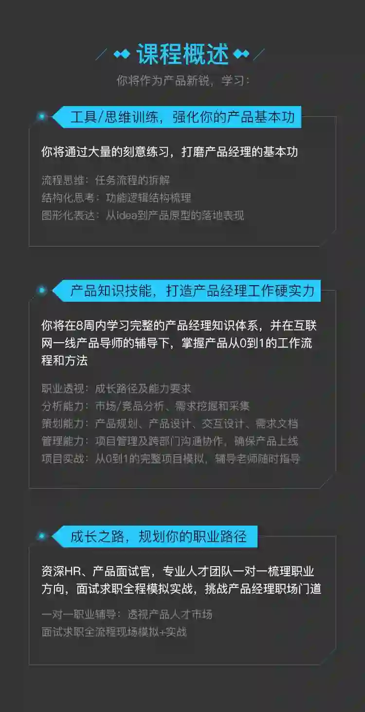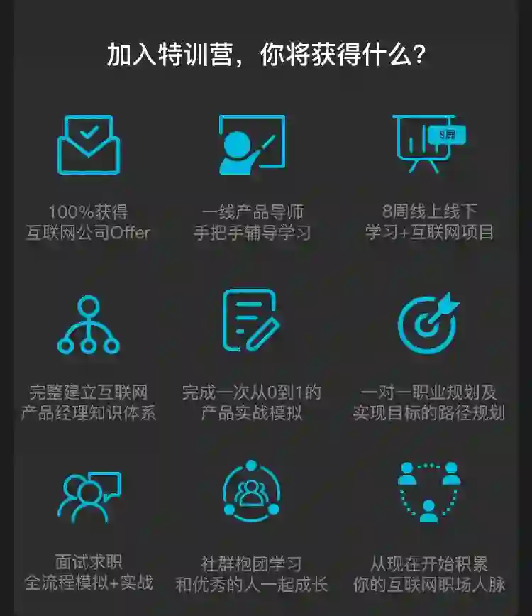 对于产品新人来讲,专业不对口、没有产品项目经验都可以接受,我们可以通过上面提到的方法去入门学习,但如果想要全面的实现产品知识体系的系统搭建,产品求职过程的相关指导,成功入职产品经理,你可以试试了解这个……