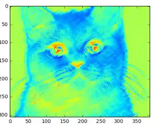 这张看起来好多了!现在我们可以看到我们的过滤器看到的一些事情。看起来红色替换掉了黑色的鼻子和黑色眼睛,蓝色替换掉了猫边界的浅灰色。我们可以开始看到图层如何捕获照片中的一些更重要的细节。