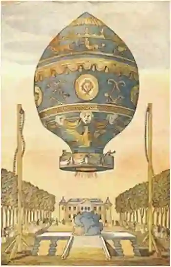 1783 年11 月21 日,物理学家德霍齐耶(J. de Rozier)以及达荷朗(M.d’Arlandes)成了史上最先飞行的人。他们在成千巴黎人,包括皇室成员和富兰克林的见证下,乘坐由孟戈菲兄弟(brothers Joseph and Etienne Montgolfier)设计的热气球飞行,很快地激起一股热气球风潮。