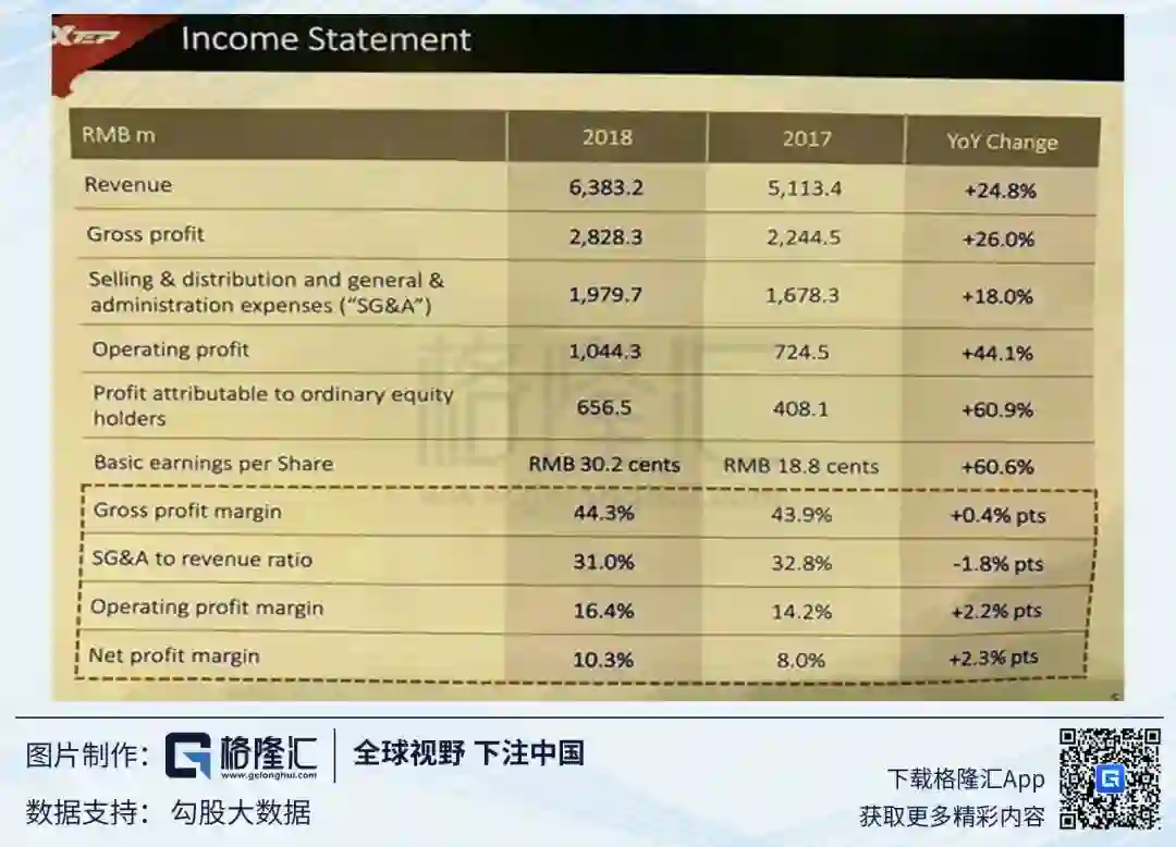 特步2018年全年收入增加24.8%至人民币63.83亿,毛利率增加至44.3%(2017年是43.9%),毛利率上升主要原因是功能性跑鞋卖得好,这类产品的毛利率比较高。应占溢利增加60.9%至人民币6.56亿。管理层表示,2018年下半年销售增长30.4%,比上半年增长要快,这个增长的势头在2019年头两个月还是维持在一个很好的水平。