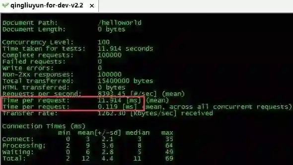 下面是对 helloworld 页面以 100 并发数进行 10 万次请求的测试结果,平均每个请求耗时 11.9 毫秒。