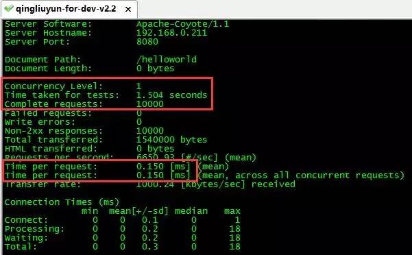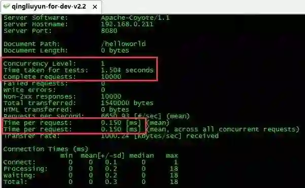 下图是对 helloworld 页面进行 10000 次连续请求的测试结果,总耗时 1.504 秒,平均每个请求耗时 0.15 毫秒。