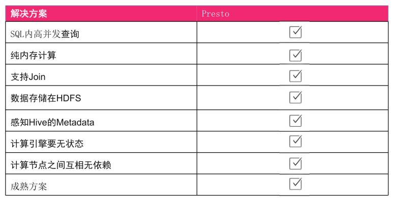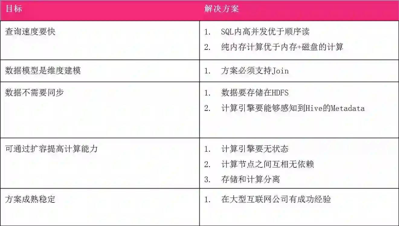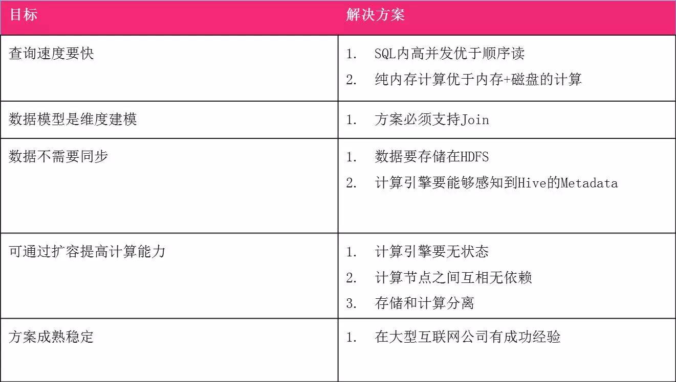 首先查询速度要快,我们需要一个SQL内在的高并发。其次用纯内存计算代替内存+硬盘的计算,内存+硬盘的计算讲的就是Hive,Hive一个SQL启动一下,包括实际计算过程都是很慢的。第二个是数据模型,刚才讲到数据仓库才是维度建模的,必须支持Join,像外面比较流行的Druid或者ES的方案其实不适用了。第三个就是数据不需要同步,意味着需要数据存在HDFS上,计算引擎要能够感知到Hive的Metadata。第四个是通过扩容提高计算能力,如果想做到完全没有服务降级的扩容,一个计算引擎没有状态是最好的,同时计算的节点互相无依赖。最后一点是方案成熟稳定,因为这是在尝试新的OLAP方案,如果这个OLAP方案不稳定,直接影响到了用户体验,我们希望线上出问题时我们不至于手忙脚乱到没办法快速解决。