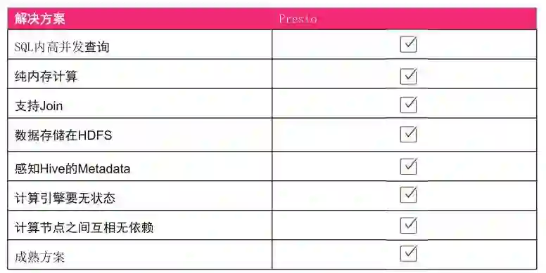 从原理上来看,高并发查询因为是MPP引擎的支持。纯内存计算,它是纯内存的,跟硬盘没有任何交互。第三,因为它是一个SQL引擎,所以支持Join。另外数据没有存储,数据直接存储在HDFS上。计算引擎没有状态,计算节点互相无依赖都是满足的。另外它也是一个成熟方案,Facebook本身也是大厂,国外有谷歌在用,国内京东也有自己的版本,所以这个东西其实还是满足我们需求的。