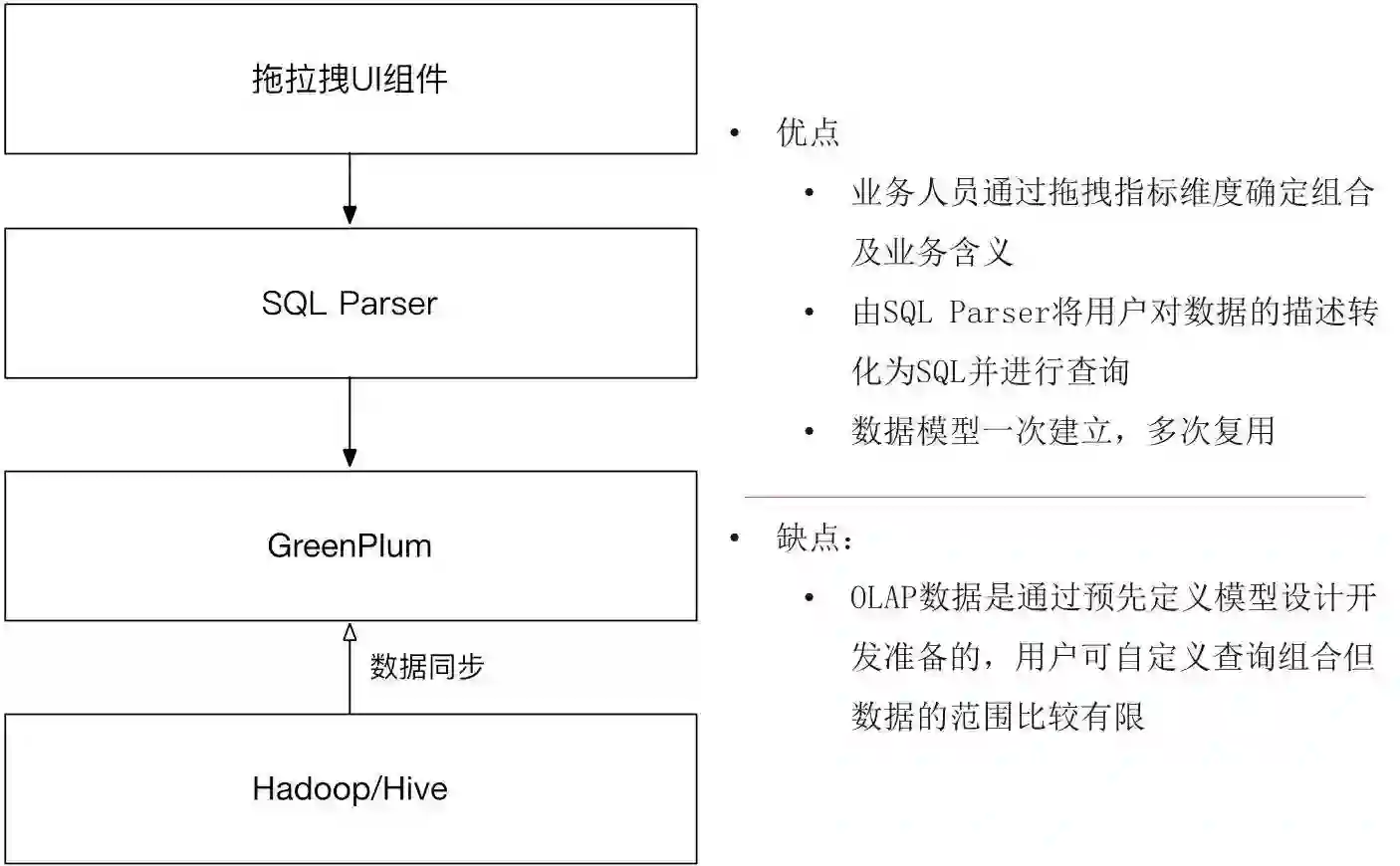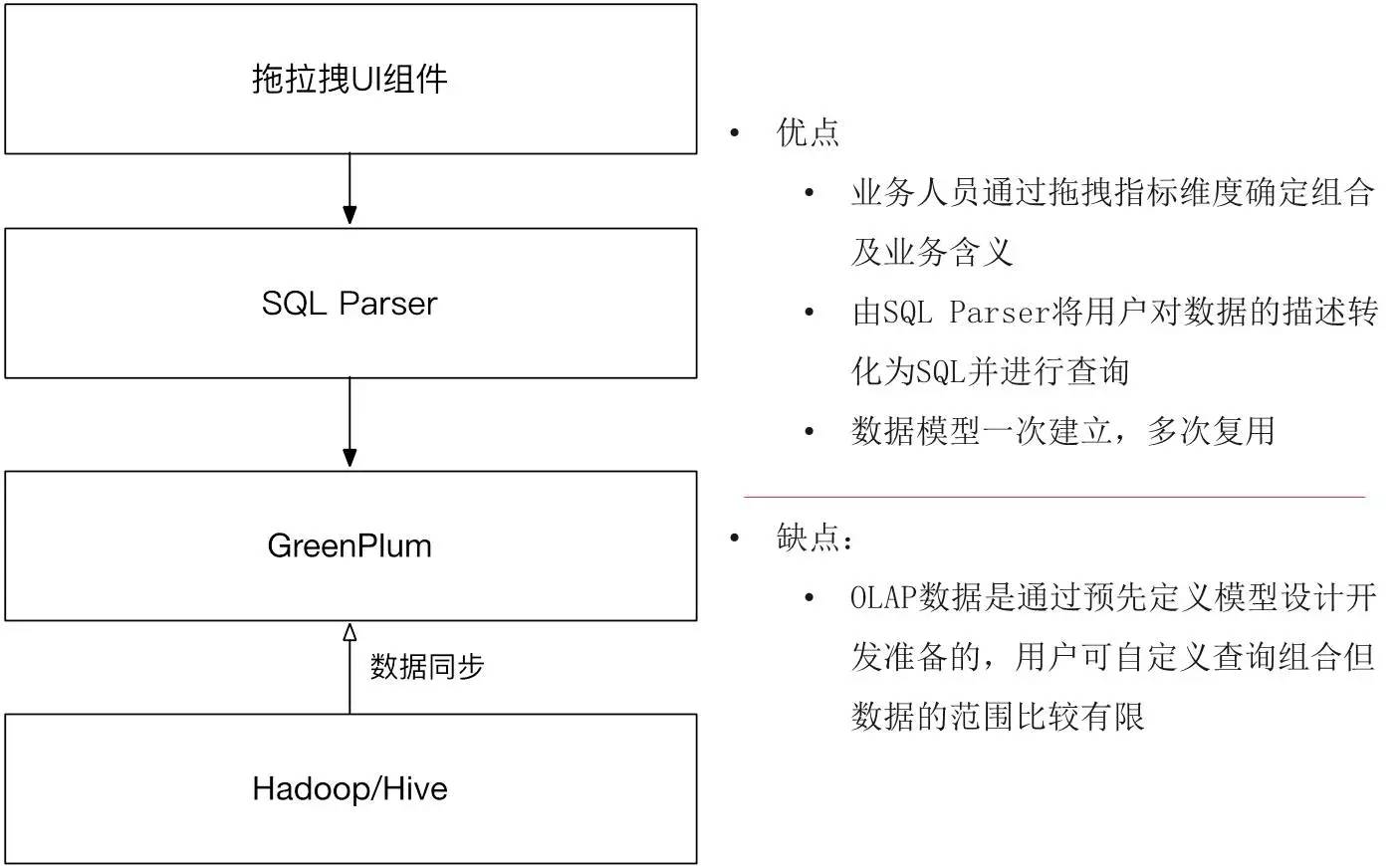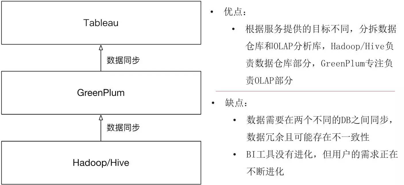 但问题是增加了新的同步机制,需要在两个不同的DB之间同步数据。同步数据最显而易见的问题就是除了数据冗余外,如果数据不同步怎么办?比如ETL开发在Hadoop上更新,但没有同步到GreenPlum上,用户会发现数据还是错误的。第二,对用户来说,当他去做OLAP分析时,Tabluea是更适合做报表的工具,随着我们业务的扩展和数据驱动不断的深入,业务不管分析师还是商务、运营、市场,他们会越来越多地想组合不同的指标和维度去观察自己的数据,找自己运营的分析点。传统的Tabluea报表已经不能满足他们。