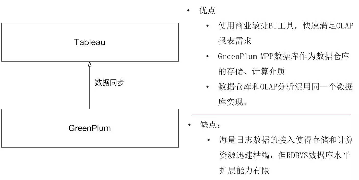 这样一个架构其实是一个通用的架构,像Tableau可以轻易被替换, GreenPlum也可以替换成Oracle之类的,这样一个常用的工具、一个架构,其实满足了部分的需求,但也有个问题,就是像GreenPlum这样的RDBMS数据库,在面对海量的数据写入时存储和计算的资源快速地枯竭了, GreenPlum的水平扩展有限,所以同样碰到了大数据的问题。