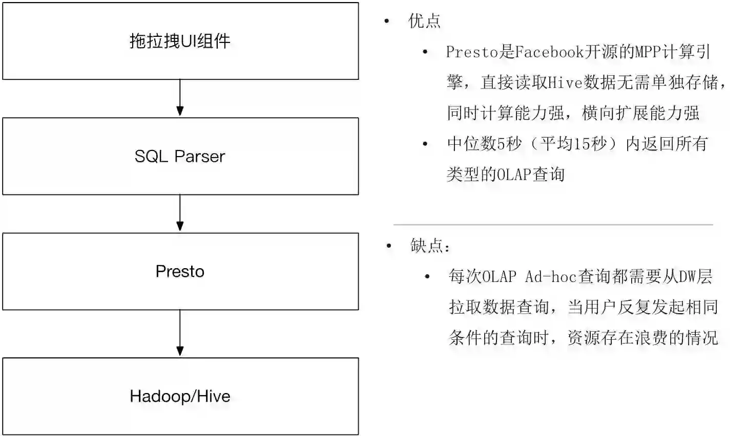 在Presto引进来之后,我们发现整个数据架构变得非常顺畅,上层用拖拉拽的UI组件生成传给SQL到Parser,然后传给Presto执行。不管是流量数据,还是埋点,还是曝光数据返回非常快,同时我们也把场景扩展到包括订单、销售之类的事务型分析上。用了之后中位数返回时间5秒钟,平均返回时间15秒,基本上这段时间可以返回所有的OLAP查询。因为用了DW数据,维度更丰富,大多数的需求问题被解决。