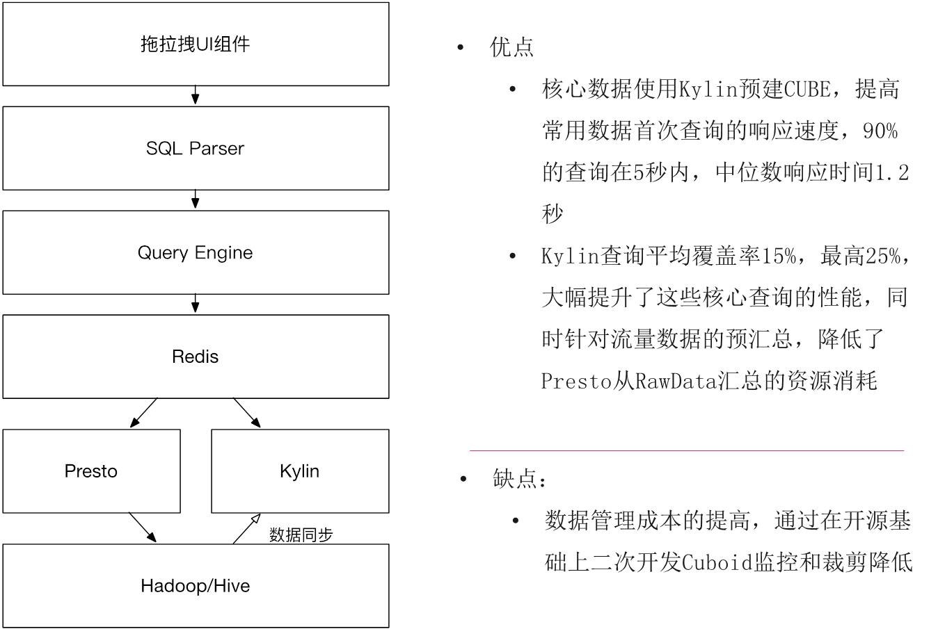 前端是这样的产品,后端也要跟着它一起变。首先前端是一个拖拉拽的UI组件,这个组件意味着用传统的选择SQL,直接形成报表的方式已经不可行了,因为所有的一切不管是维度指标都是用户自己组合的,所以我们需要一个SQL Parser帮助用户把它的数据的描述转化成SQL,还要进行性能的调优,保证以一个比较高的性能反馈数据。
