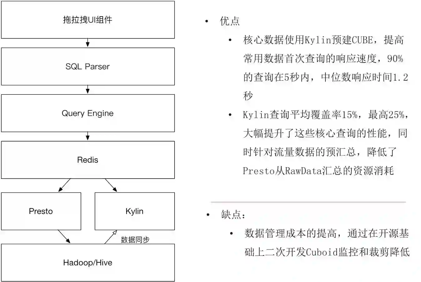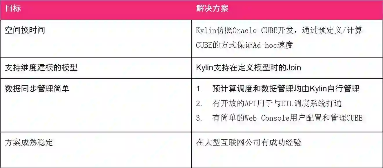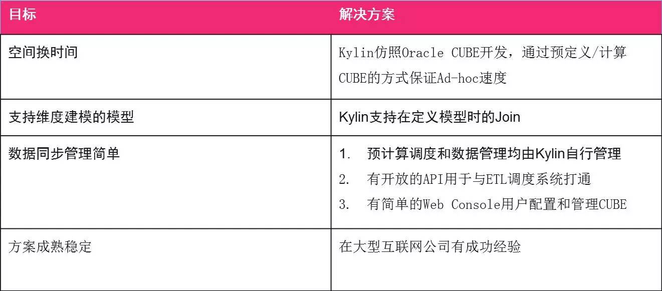 首先空间换时间,我们在刚开始引入Kylin时跟Kylin开发聊过,他们借鉴了Oracle CUBE的概念,对传统数据库开发的人来说很容易理解概念和使用。支持维度建模自然支持也Join。预计算的过程是由Kylin自己管理的,也开放了API,与调度系统打通做数据刷新。另外Kylin是在eBay上很大的、美团也是投入了很大的精力的有成功经验的产品,所以很容易地引进来了。