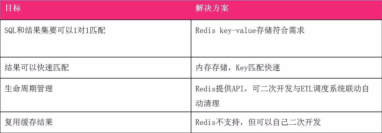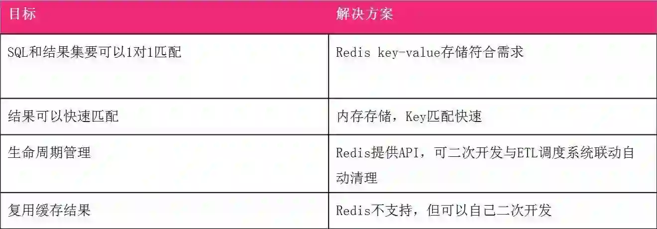 首先我们想要的是SQL跟结果一对一匹配,它是非常符合这个需求的。其次我们希望缓存更快的返回,Redis是纯内存的存储,返回速度非常快,一般是毫秒级。第三个生命周期管理,它提供API,我们做二次开发,跟我们ETL调度系统打通,处理更新时就可以通知什么样的数据可以被用到。而缓存复用是不支持的,我们可以自己来做。