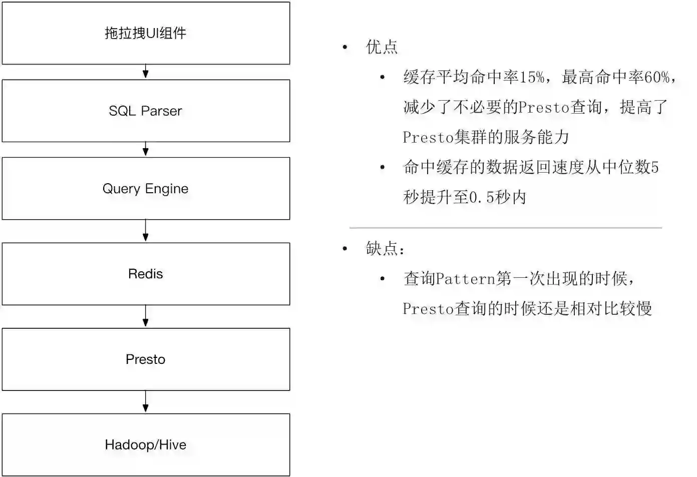 因为我们有不同的主题,流量主题、销售、收藏、客户,类似不同的主题,用户查询的组合不一样,特殊的场景下,命中率达到60%,这样除去缓存的返回速度非常快之外,缓存也有好处,就是释放了Presto的计算能力,原先需要跑一次的查询便不需要了。释放出来的内存和CPU就可以给其它的查询提供计算能力了。
