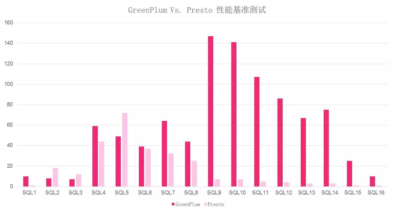 整体而言相同节点的Presto比GreenPlum的性能提升70%,而且SQL9到SQL16都从100多秒下降到10秒,可见它的提升是非常明显的。