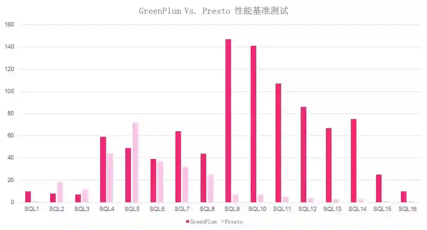 我们在用之前做了POC。我们做了一个尝试,把在我们平台上常用的SQL(不用TPCH的原因是我们平台的SQL更适合我们的场景),在GP和Presto两个计算引擎上,用相同的机器配置和节点数同时做了一次基准性能测试,可以看到结果是非常令人欢喜的。