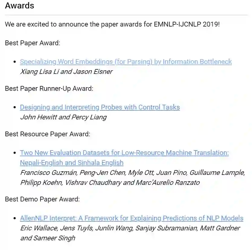 本次 EMNLP-IJCNLP 大会颁发了最佳论文奖、最佳资源奖、最佳 Demo 奖等多个奖项,以下是具体的获奖信息。