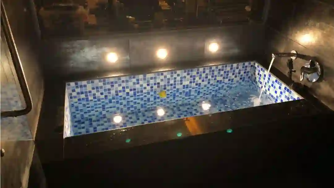 虽然它只有1.5平米,但是一个游泳池该有的元素它都有。比如射灯,还有蓝白相间的瓷砖。