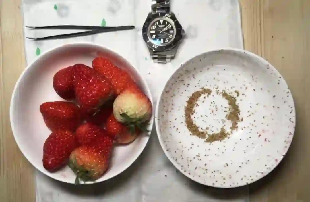 我还数了一颗草莓上平均有多少颗草莓籽,这个答案可以告诉你们,289.2颗。这个很快,3个小时就数完了。
