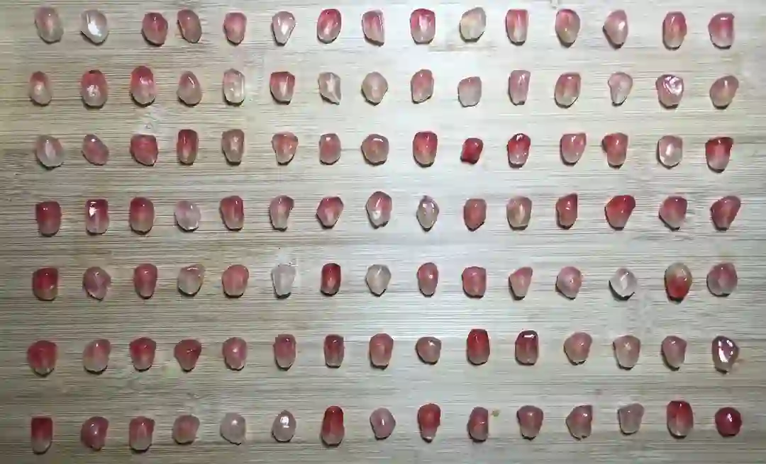 我当时举办了一次石榴籽选美大赛。我们当时仔细测量了每一颗石榴籽的尺寸,观察每一个石榴籽的切工。