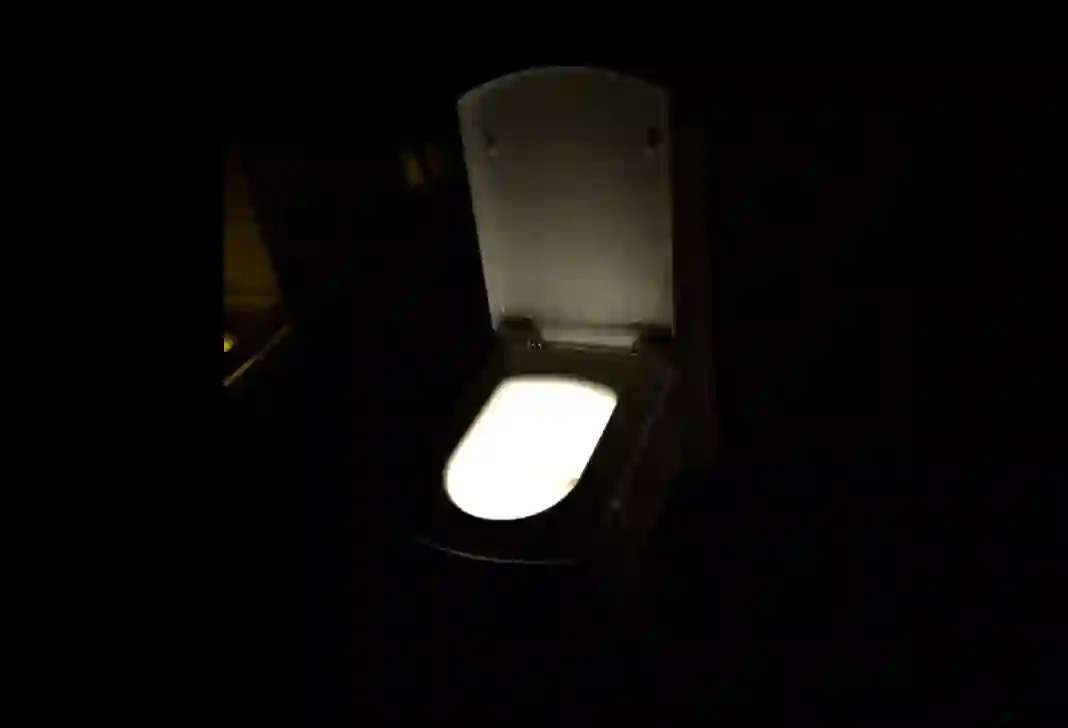 这是我的马桶,本来我一开始的想法是,晚上它能发光,上厕所的时候就方便一点。但后来他们说这是“明人不拉暗屎”。