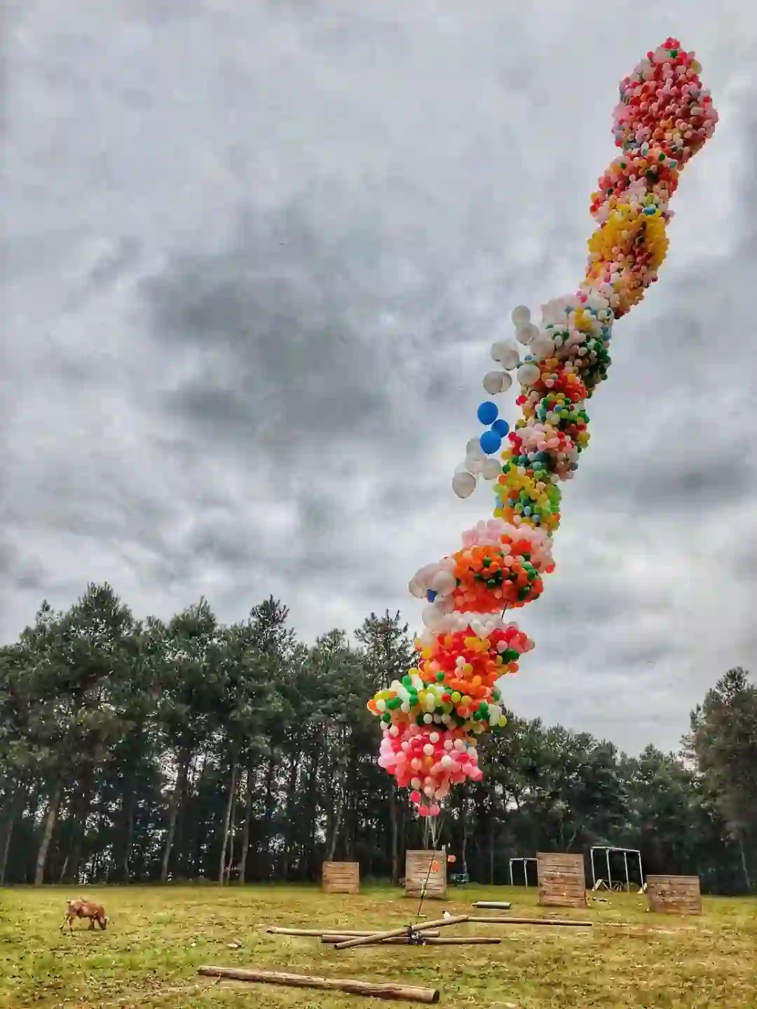 这是一头红色的猪。你们想没想过,多少个气球能把一头猪吊起来?算了,你们没想过。我去试了,答案是,两万个。