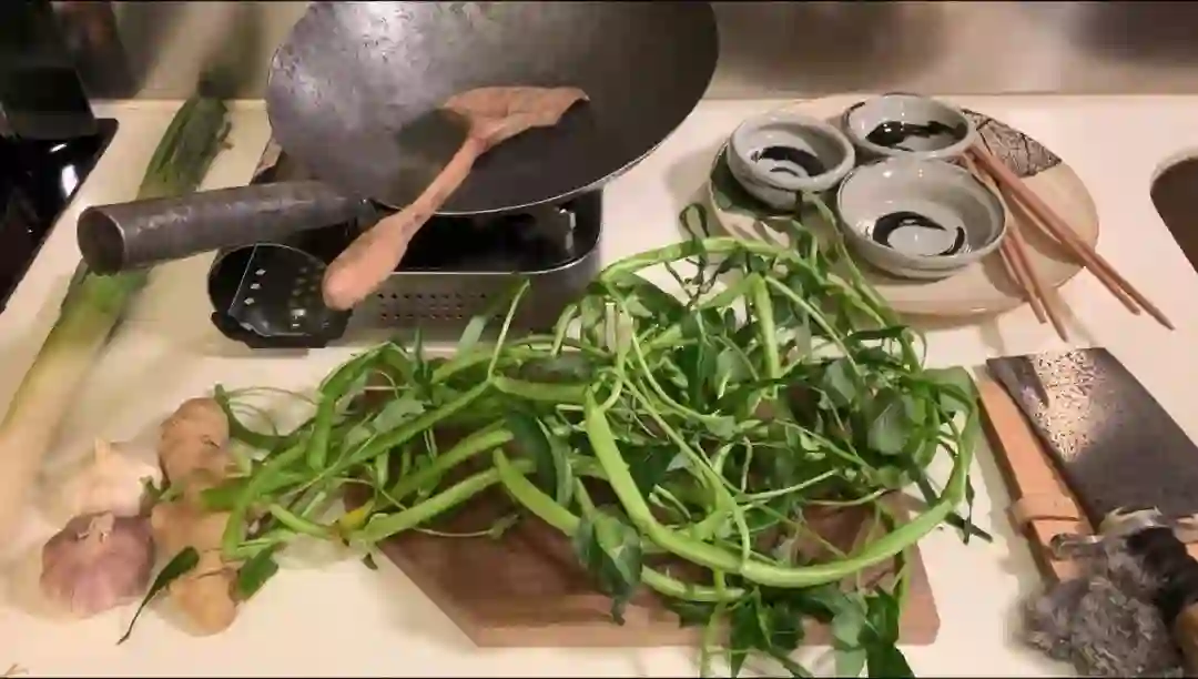 当我以为所有的东西都已经准备完,可以开始炒菜的时候,我把朋友叫来家里,摘下长得过于成熟的空心菜。