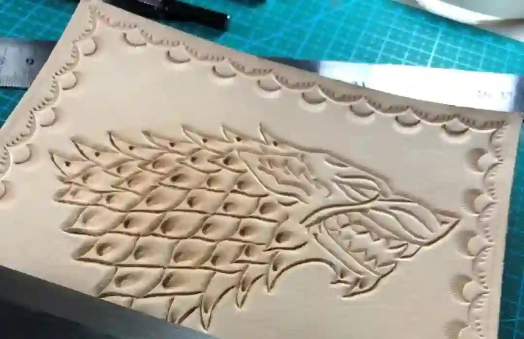 这把刀有个名字叫权力的菜刀,因为它的刀柄是《权力的游戏》里的一把剑。这些狼头都是自己做的,这个狼确实看起来有点像狗。