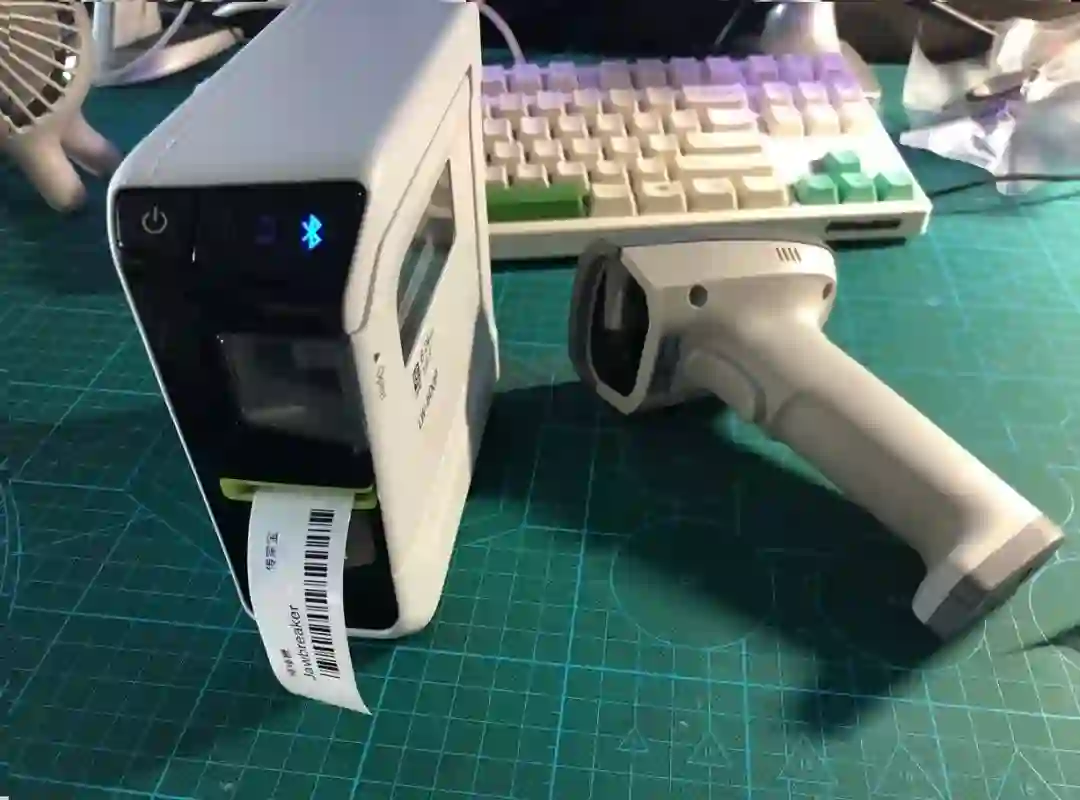 这是一个条形码打印机和一个扫码枪,就是你们在超市里看到的那种。