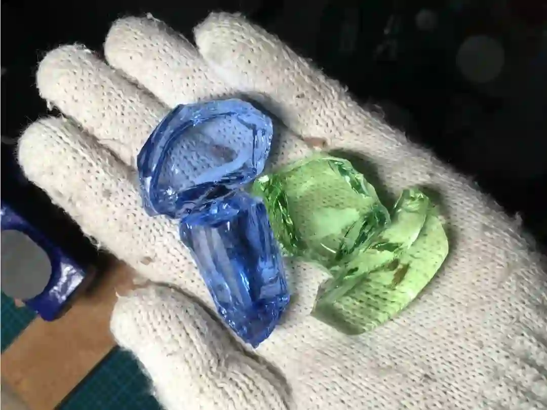 这是几个碎掉的玻璃杯子,先把它磨成一个圆柱体。再用专门打磨宝石的八角机,通过调整各种角度,最后磨成钻石的形状。这就是传说中的八心八箭。