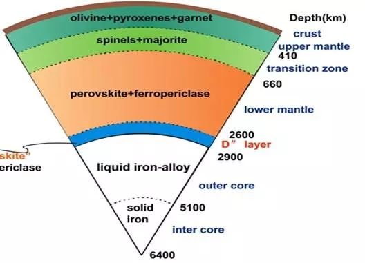 图2. 地球截面展示了各地幔层的主要矿物结构形态。