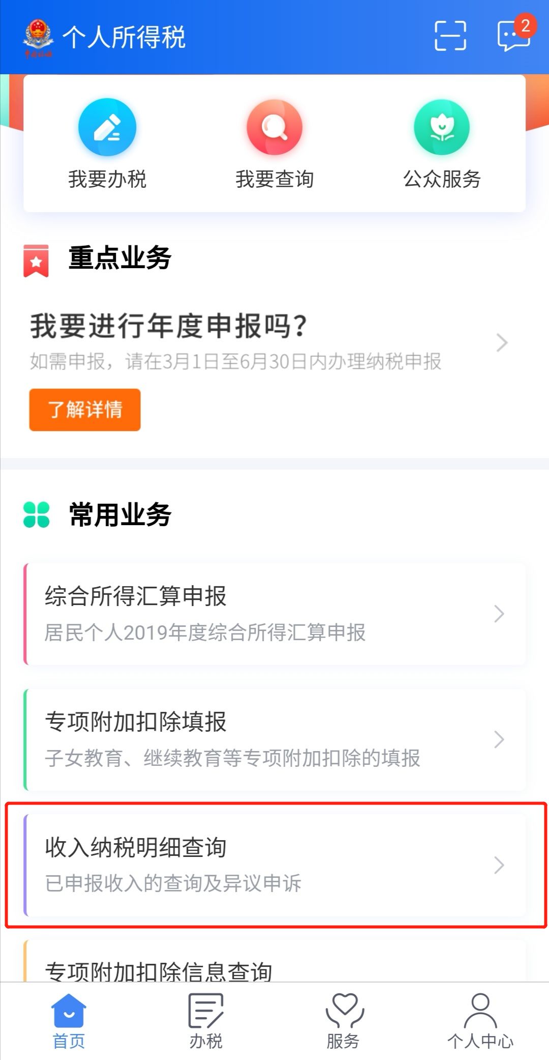 2. 在首页常用业务中点击收入纳税明细查询