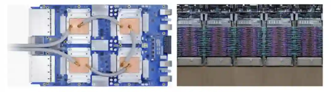 单个TPU v3设备(左)和TPU v3 Pod的一部分(右)