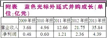 蓝色光标是一个赚差价的公司,它用资本市场的高PE溢价募集而来的钱去低价收购公关行业内的同行,然后再到资本市场变现。换句话说,在证券市场用最高110倍的PE 募资然后在线下花10倍PE买未上市公司(例如SNK),仅仅4年时间,公司营收就从上市前的3.68亿元跃升到2013年的35.84亿,业绩增长近10倍;利润也从4845万跳升到4.39亿,上涨9.15倍。在公司2012年2.36亿的盈利中,一半来自并购。3~4年的时间公司股价从7.49元涨到最高68.79元(复权),上涨了8倍,以今天(2014/5/4)51.88块钱算也增长了6.9倍,这就是将并购的增长发挥到了极致。