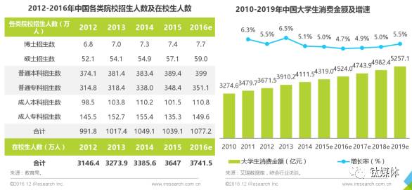 艾瑞咨询《2016年中国大学生消费市场研究报告显示》:自2012年以来,中国大学生人数一直迅猛增长。至2015年,在校大学生人数已达3647万人。2016年我国大学生消费市场规模达到4524亿,同比增长4.7%。艾瑞咨询预测,这一数字还将在未来持续增长。而这样庞大的基础市场,也给了银行除政策推动以外,“不得不入”的重要动力。