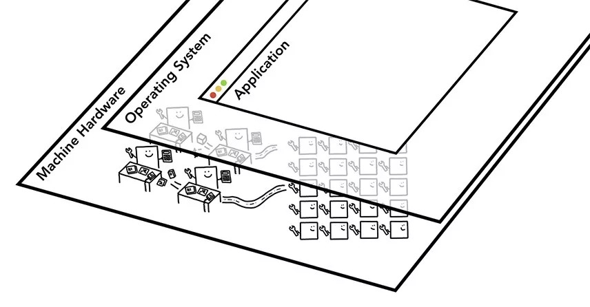 如上图所示,三层计算机体系结构中,硬件位于底部,操作系统位于中间,应用程序则在最上层。