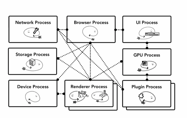 同样的方法也适用于浏览器进程。Chrome 正在进行体系结构更改,以便将浏览器程序的每个部分,作为一项服务运行,从而可以轻松拆分为不同的流程或汇总为同一个流程。