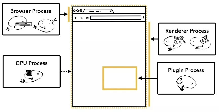 最重要的是浏览器进程,如何与负责应用程序不同部分的其他进程协调。对于渲染器进程,将创建多个进程,并将其分配给每个选项卡。直到最近,Chrome 才为每个标签提供了一个执行进程,现在它尝试为每个站点提供自己的进程,包括 iframe。