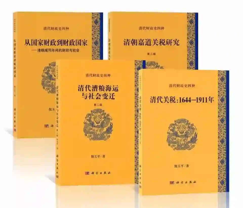 倪玉平教授在科学出版社出版的《清代财政史四种》也受到广大读者的一致欢迎。《从国家财政到财政国家——清朝咸同年间的财政与社会》、《清朝嘉道关税研究》(第二版)、《清代漕粮海运与社会变迁》(第二版)和《清代关税:1644-1911年》四卷,集中体现了倪玉平教授多年来研究清代财政史的成果。