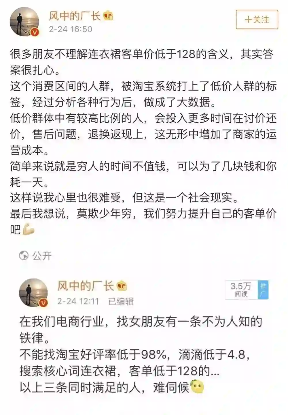 对此话题,昨日网上却掀起了一个关于“连衣裙客单价低于128”的讨论,有网友解释,这个消费区间的人群,被淘宝系统打上了低价人群的标签,经过分析各种行为后,做成了大数据。低价群体中有较高比例的人,会投入更多时间在讨价还价,售后问题,退换返现上,这无形中增加了商家的运营成本。(新浪科技)