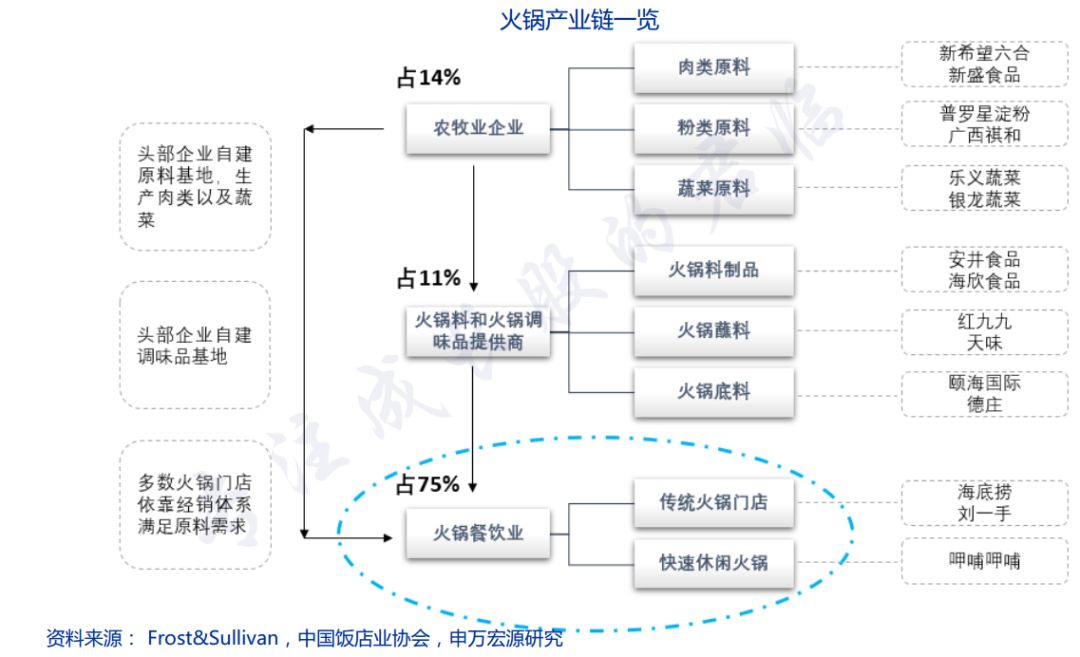 上游为原材料供应和供应链的管控,中游为火锅底料和调味料,下游则是火锅门店。