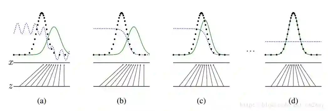 这张图表明的是GAN的生成网络如何一步步从均匀分布学习到正太分布的。原始数据x服从正太分布,这个过程你也没告诉生成网络说你得用正太分布来学习,但是生成网络学习到了。假设你改一下x的分布,不管什么分布,生成网络可能也能学到。这就是GAN可以自动学习真实数据的分布的强大之处。