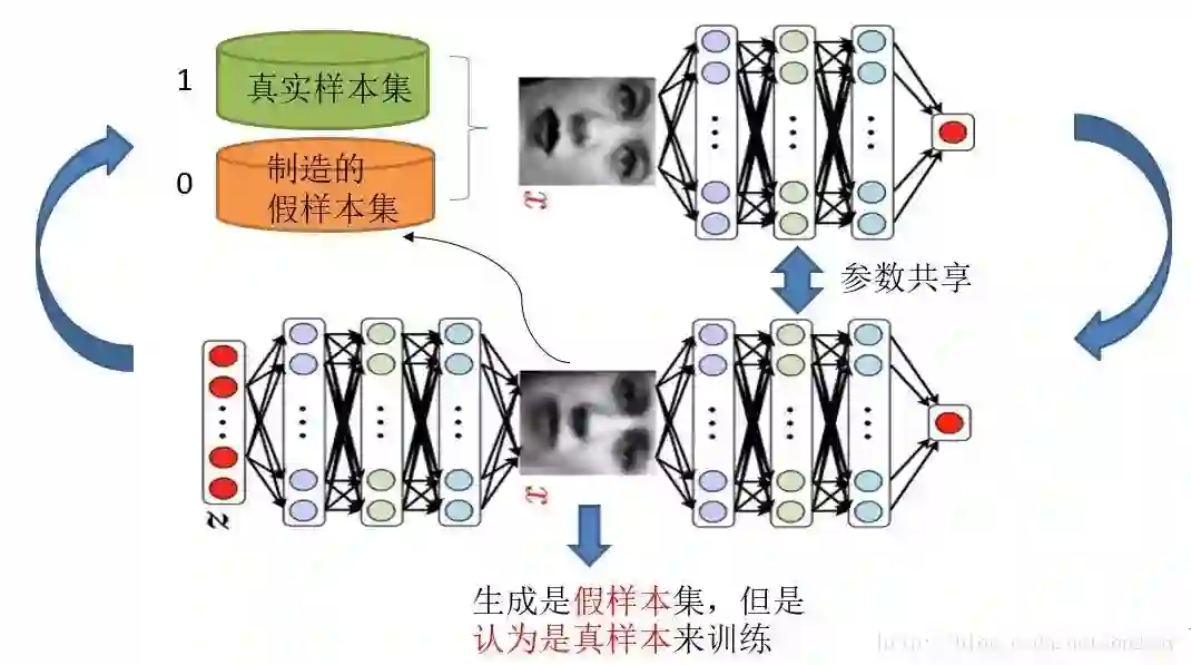 那么为什么要这样呢?我们想想,是不是这样才能起到迷惑判别器的目的,也才能使得生成的假样本逐渐逼近为正样本。好了,重新顺一下思路,现在对于生成网络的训练,我们有了样本集(只有假样本集,没有真样本集),有了对应的label(全为1),是不是就可以训练了?有人会问,这样只有一类样本,训练啥呀?谁说一类样本就不能训练了?只要有误差就行。还有人说,你这样一训练,判别网络的网络参数不是也跟着变吗?没错,这很关键,所以在训练这个串接的网络的时候,一个很重要的操作就是不要判别网络的参数发生变化,也就是不让它参数发生更新,只是把误差一直传,传到生成网络那块后更新生成网络的参数。这样就完成了生成网络的训练了。