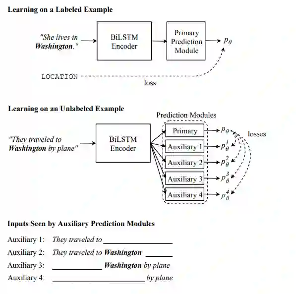 因此,我们提出了 Cross-View Training(CVT),这是一种半监督学习算法,可混合使用有标注和无标注数据来提升 Bi-LSTM 句子编码器的表征。在有标注的样本上,我们使用标准的监督学习。在无标注的样本上,CVT 会教能看到输入的受限视角(比如句子的一部分)的辅助预测模块匹配能看到完整输入的整个模型的预测。因为辅助模块与完整模型共享中间表征,所以这反过来又能改进整个模型。