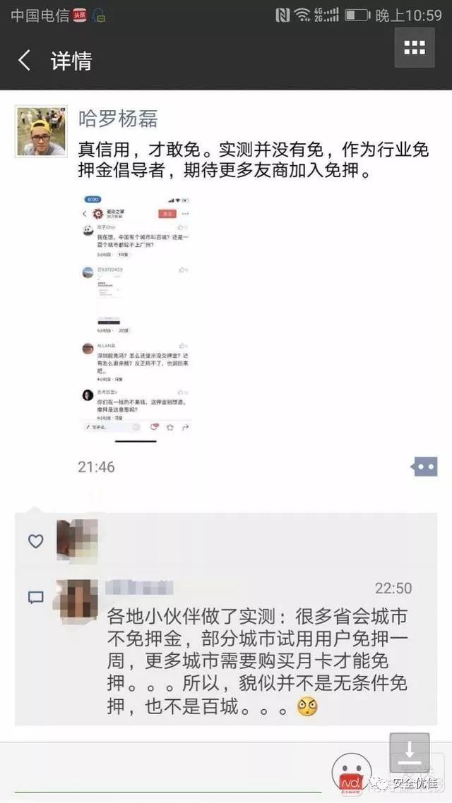 6月12日晚上10点,哈罗单车CEO杨磊转发一个对“摩拜百城免押”的报道评论称:“真信用,才敢免。实测并没有免,作为行业免押金倡导者,期待更多友商加入免押。”