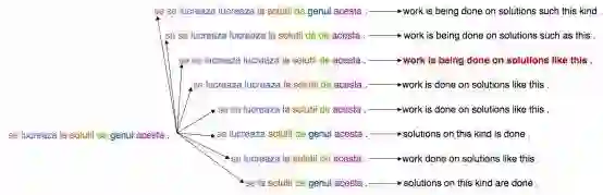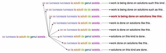 我们模型的好处之一是用简单的方法来获得更好的翻译:尝试并行几个不同的生成计划,然后从另一个同样快速的翻译模型中选择最好的输出。下面以罗马尼亚语-英语的示例显示“噪音并行解码”过程: