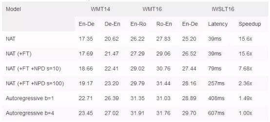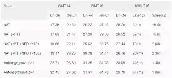 表1:五个流行数据集的非自回归翻译模型的结果。标有“NAT”的行显示了我们模型的性能,没有我们称之为微调的额外训练步骤;“NAT-FT”则包括这些步骤。“NPD”是指噪声并行解码,这意味着要并行地尝试几个不同的生成计划,然后选择最好的一个。自回归模型使用相同的架构和相同的模型大小;“b = 4”表示波束大小为4的波束搜索。