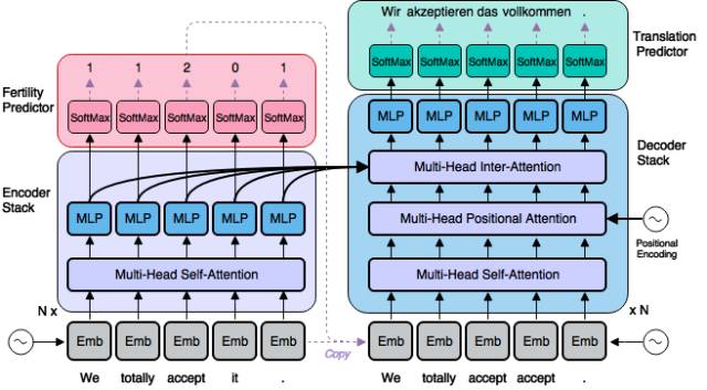 下一个动画展示了我们模型的基本工作方式。其中,编码器和解码器都可以并行工作,而不是逐个单词地输出。现在编码器有两个任务:首先它必须对输入句子进行理解和解释,但是它也必须预测一系列数字(2,0,0,2,1),然后将其用于启动并行解码器,这可以通过直接从输入的文本中进行复制,而不需要进行棕色箭头所指的自回归操作。这些数字被称为生成力(fertilities); 它们代表了每个单词在输出句子中所占有的空间。所以如果一个单词的生成力是2,那么这意味着模型决定在输出中分配两个单词来对其进行翻译。