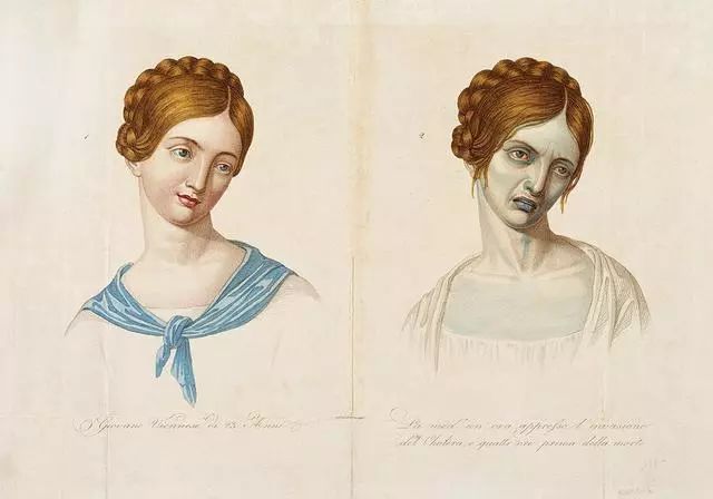 绘画作品中一位年轻女郎感染霍乱前后的面容。图片来自:The Sick Rose: Disease and the Art of Medical Illustration