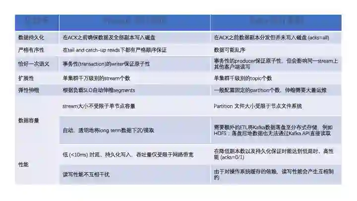 为了详细解释这三点,我们可以先用下表来简单对比一下 Pravega 和 Kafka 设计哲学的不同之处,这也代表了流存储和消息队列的本质差异: