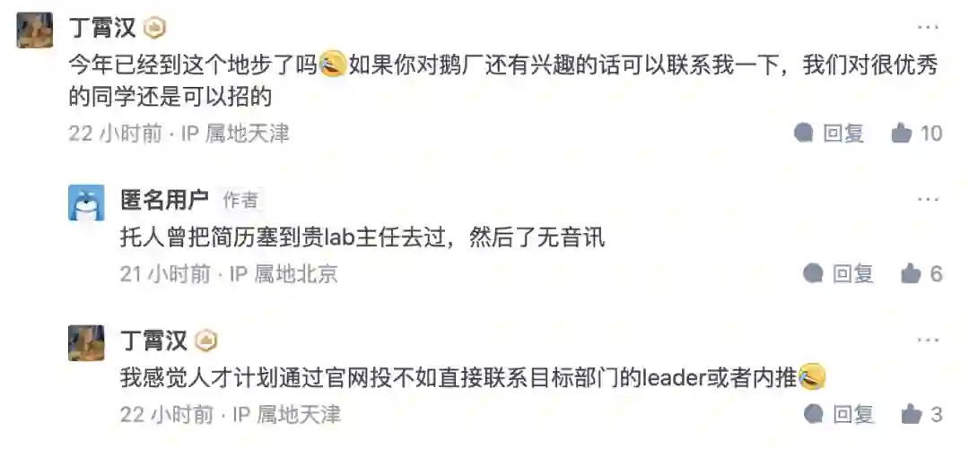 腾讯: 腾讯是让我最难受的公司。从6月投腾讯大咖,至今没有一个hr联系我,周围同学也只有1-2个同学被联系了。今年腾讯大咖可能只会招特别match的同学且hc极少。