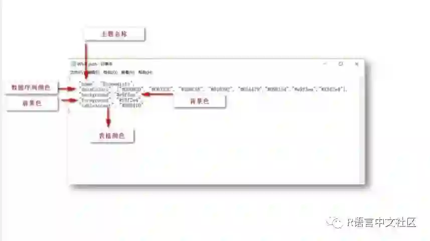 一个花括号内部一共对应五组键值对,第一行时主题名称,第二行是序列颜色(也就是我们需要自定义的重点,一般需要6组以上),第三组是背景色、第四组是前景色,第五组是作用于矩阵表格等的颜色。